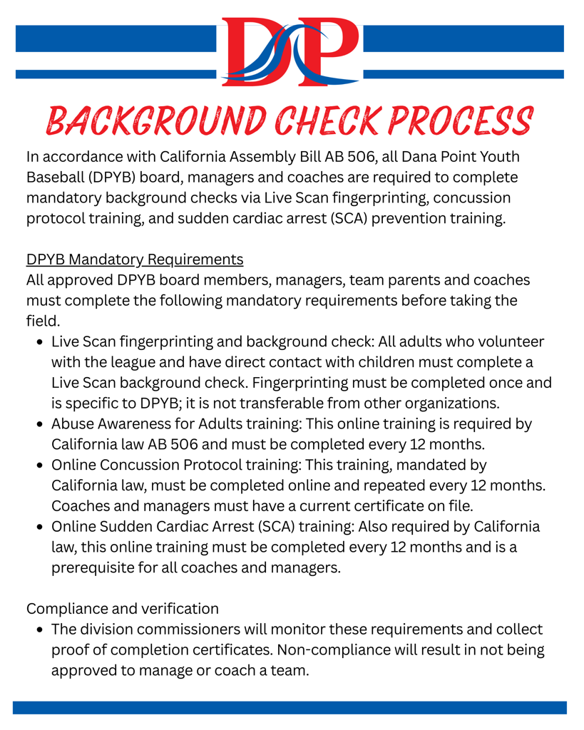 Thank you for your interest in managing a Spring 2026 DPYB team. We have four requirements before you can take the field in addition to board approval.