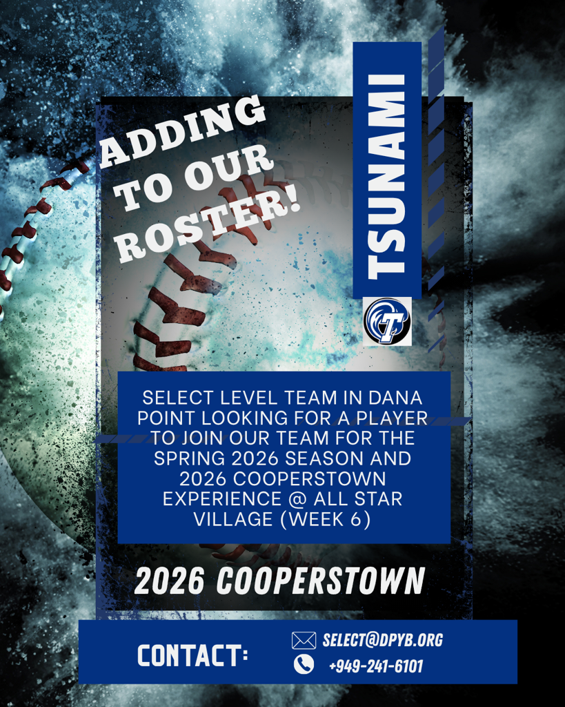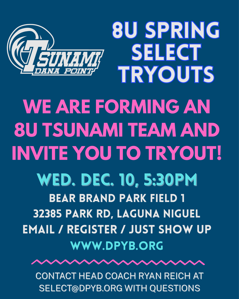 If you are interesting in playing for a Tsunami team, please reach out to select@dpyb.org. Tryouts are typically held once a year in the late summer. There is an 8u team forming for Spring 2026 that will be formed in December/January and is looking for players.